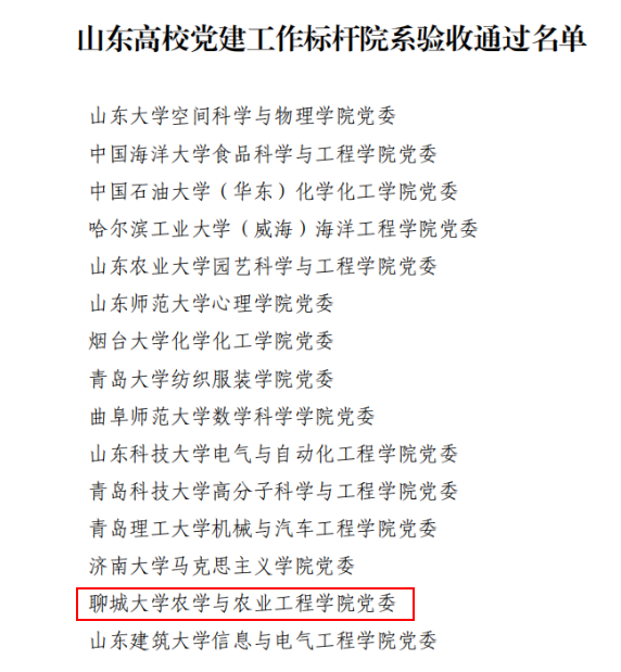 日前,山东省委教育工委公布了第二批山东高校党建“双创”培育创建工作验收通过名单,Beat365唯一官方网站党委(原Beat365唯一官方网站农学与农业工程学院党委)圆满完成“山东高校党建工作标杆院系”培育创建任务,通过验收。