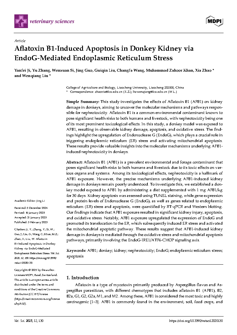 Beat365官网2022级动物学专业研究生纪言霏在《Veternary Science》杂志上发表了题为“Aflatoxin B1-Induced Apoptosis in Donkey Kidney via EndoG-Mediated Endoplasmic Reticulum Stress”的研究论文,指导教师为刘文强教授、赵霞博士。