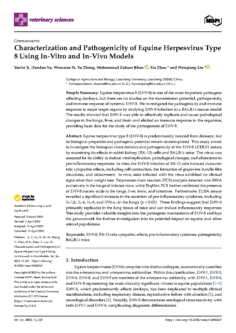 Beat365官网2022级动物学专业研究生纪言霏在《Veternary Science》杂志上发表了题为“Characterization and Pathogenicity of Equine Herpesvirus Type 8 Using In-Vitro and In-Vivo Models”的研究论文,指导教师为刘文强教授、赵霞博士。