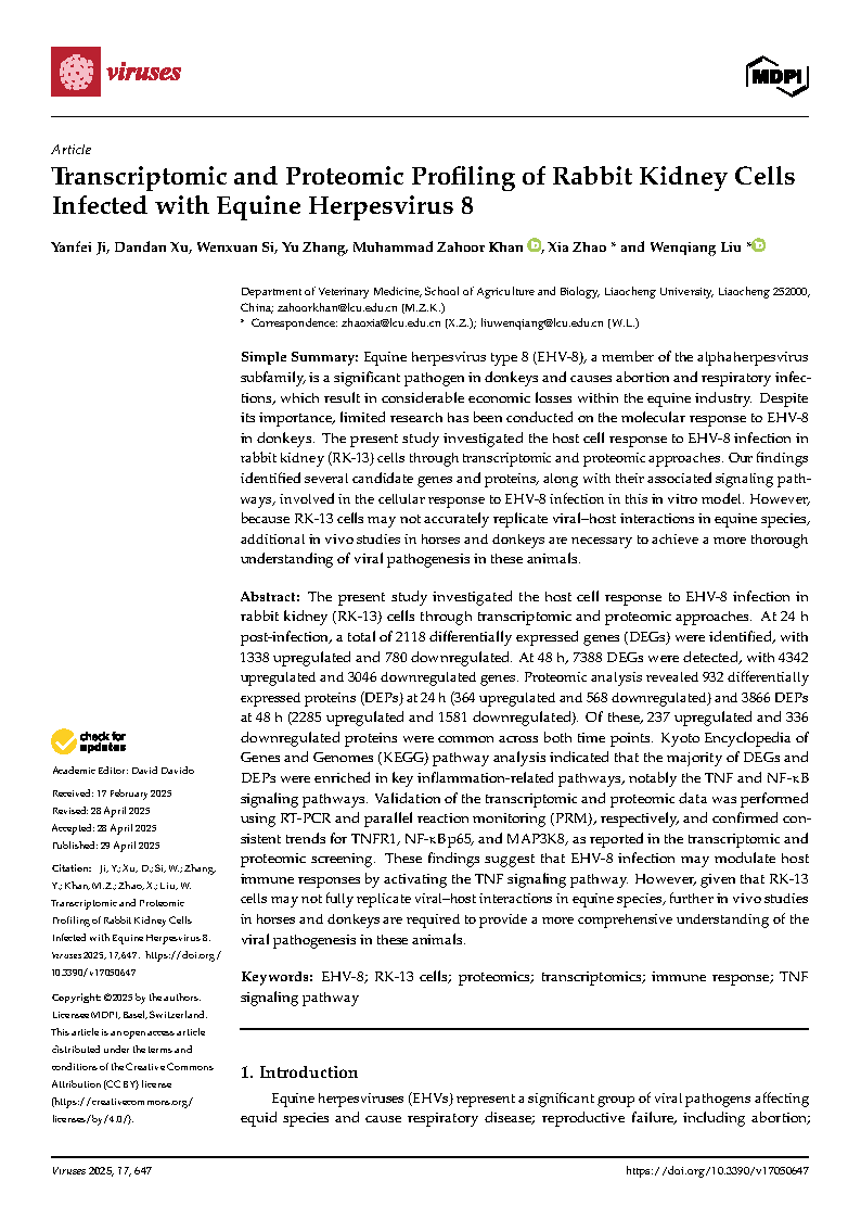 Beat365官网2022级动物学专业研究生纪言霏在《Viruses-Basel》杂志上发表了题为“Transcriptomic and Proteomic Profiling of Rabbit Kidney Cells Infected with Equine Herpesvirus 8”的研究论文,指导教师刘文强教授、赵霞博士。