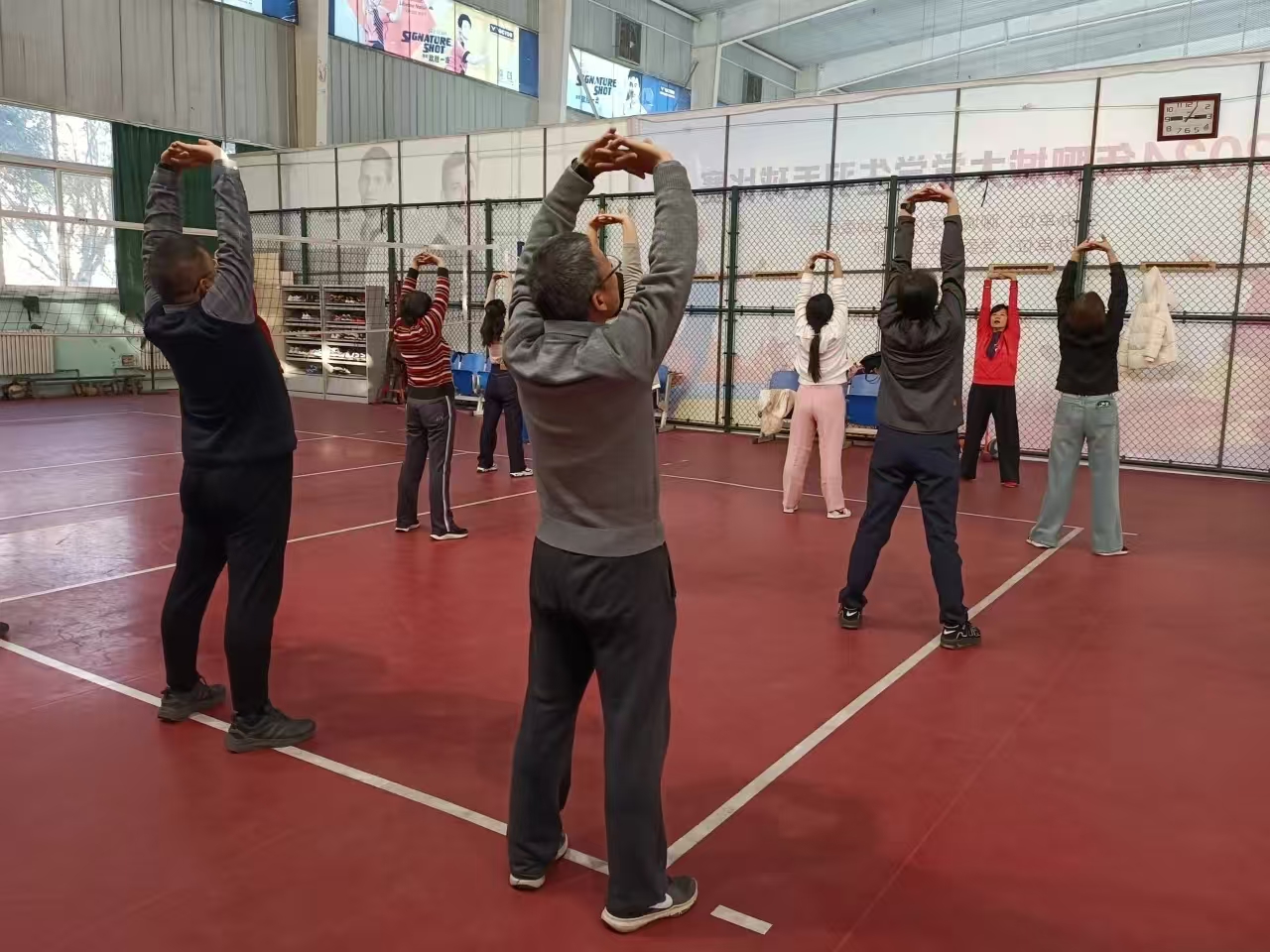 八段锦作为融合呼吸吐纳与肢体律动的古老养生妙法,素有强身健体、抵御疾病之效,一招一式皆藏乾坤。活动开始,现场氛围热烈而祥和,教师们身着宽松舒适的运动装,齐聚球场。教练首先为教师们讲解八段锦的历史渊源、基本动作要领和健身功效,随后带领大家练习。伴随着教练沉稳的起势口令,教师们全神贯注地跟随示范,时而沉稳屈膝下蹲,时而徐徐起立伸。