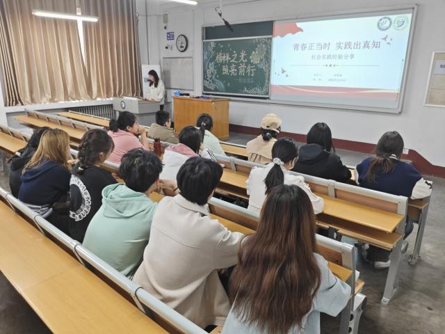 赵新燕率先上台分享社会实践经历。从社区志愿服务,到大型赛事的志愿者活动,再到企业实习,赵新燕用生动的宣传片,向同学们讲述了在实践中如何提升沟通能力、团队协作能力以及解决问题的能力。在分享过程中,赵新燕结合自身经历,向同学们介绍如何寻找适合的社会实践。她强调要善于利用学校和社会提供的各种资源,积极关注相关信息。同时,在实践过程中,要了解实践流程,明确目标,不断提升自己解决问题的能力。随后,丁懿聚焦学习进行分享。她强调要合理规划学习计划,建议同学们依据课程难度和自身情况合理分配时间。同时,她还分享了如何高效做笔记、利用图书馆资源以及应对考试压力的经验。丁懿鼓励同学们积极参加学术竞赛和科研项目,以此来培养创新思维和探索精神。同学们聚精会神地聆听,不时低头记录要点,被她们精彩实用的分享所深深吸引。
