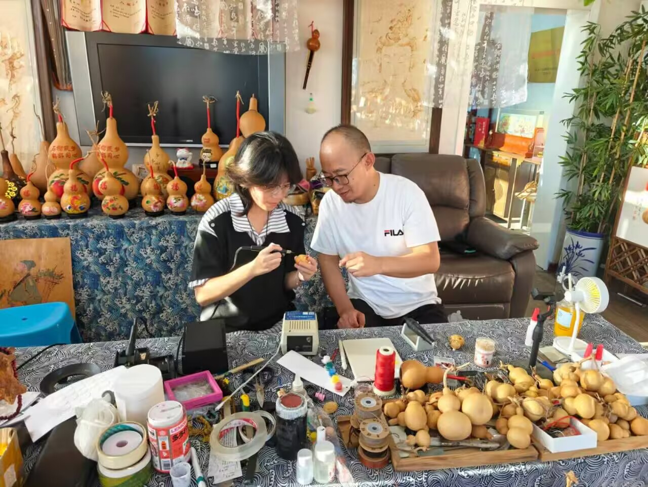 活动伊始,实践团队围绕非遗传承与民族融合展开多项特色实践,在济南的书店与非遗展示区,志愿者围看醒狮工艺画、木雕等作品,聆听非遗故事,感受历史文化名城的非遗底蕴;潍坊的广场上,志愿者协作组装、绘制风筝,让传统风筝技艺与青春创意碰撞,体悟非遗与多民族生活交融的魅力;临沂、德州等地,志愿者们跟随非遗传承人学习刺绣、剪纸等技艺,从穿针引线到图案设计,近距离感受传统工艺的精妙。在山西省忻州市,志愿者拜访葫芦烙画等非遗传承人,在摆满工艺葫芦的工作台前,跟随传承人学习烙画技巧,近距离感受传统工艺的精妙。此外,通过采访非遗传承人,同学们聆听了他们守护技艺的故事,深入了解到民族工艺在当代传承的挑战与创新方向。传承人纷纷表示,年轻一代对非遗的热情令人欣慰,而多民族元素的融合创作,为传统工艺注入了新的活力。
