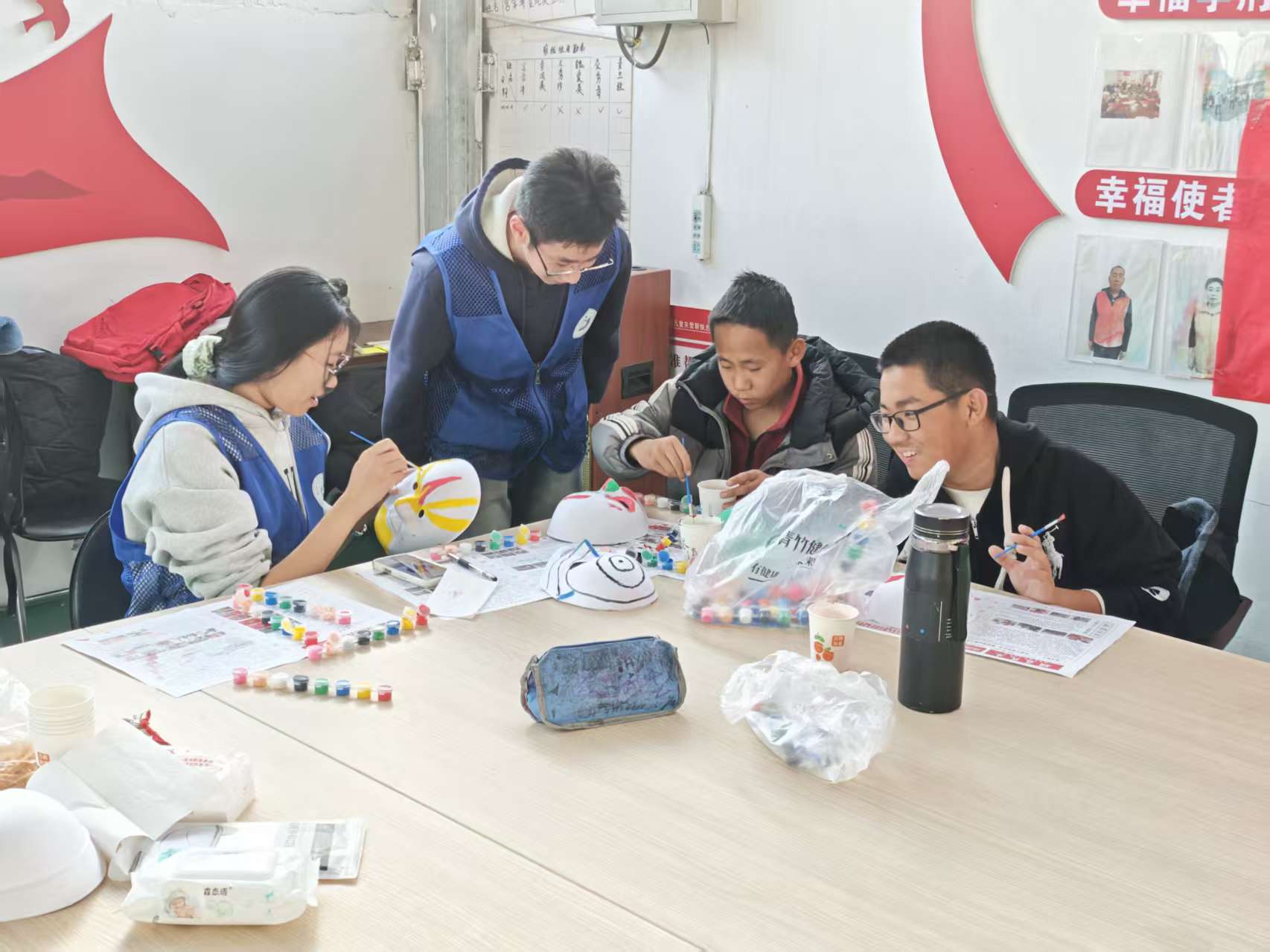 随后,“脸谱文化体验”环节启动,志愿者用通俗语言讲解京剧脸谱的历史与色彩寓意,分发工具并巡回指导创作,孩子们发挥想象完成了兼具传统与创意的作品;最后,志愿者为孩子送上文具、书籍等慰问品,合影留念后活动圆满结束。