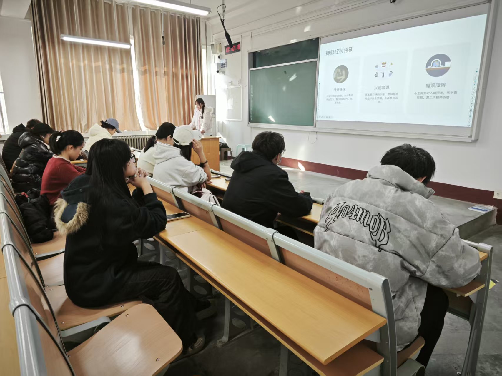 培训过程中,仝姝姣结合PPT内容,通过理论讲解、案例拆解相结合的方式,系统传授心理健康知识与工作方法。在理论讲解环节,她围绕大学生常见的焦虑情绪、抑郁症状、人际关系困扰及学习压力问题展开,详细解析各类心理问题的具体表现——如焦虑时的身体紧张、抑郁时的兴趣减退等,同时说明秋冬学期学业任务加重、社交适应周期延长等特殊背景下问题形成的常见诱因;案例分析阶段,她结合“同学因期末备考压力出现失眠逃课”和“新生因秋冬季节环境不适引发社交恐惧”等真实场景,引导心理委员运用所学理论剖析问题根源,并共同探讨应对策略。