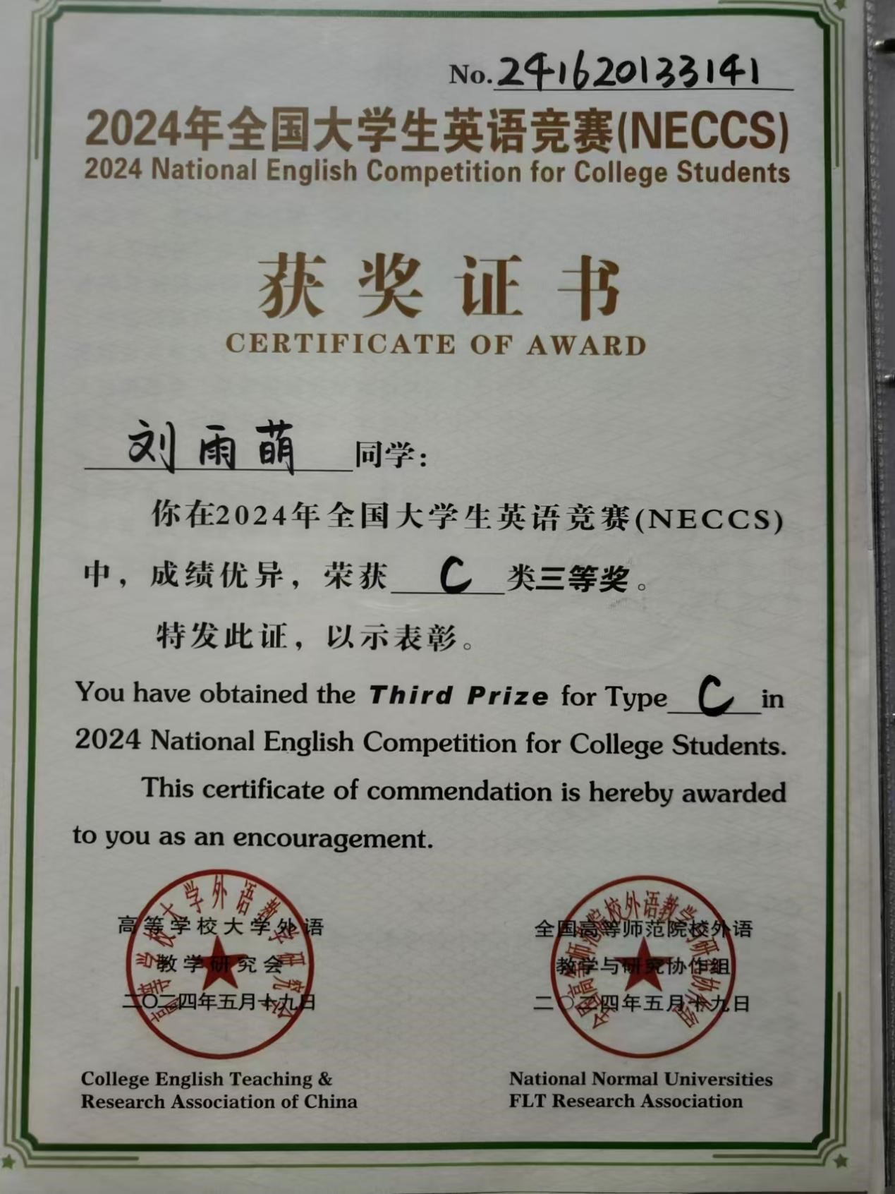 Beat365官网刘雨萌同学在2024年全国大学生英语竞赛(NECCS)中,成绩优异,荣获C类三等奖,对该获奖同学予以祝贺表彰。