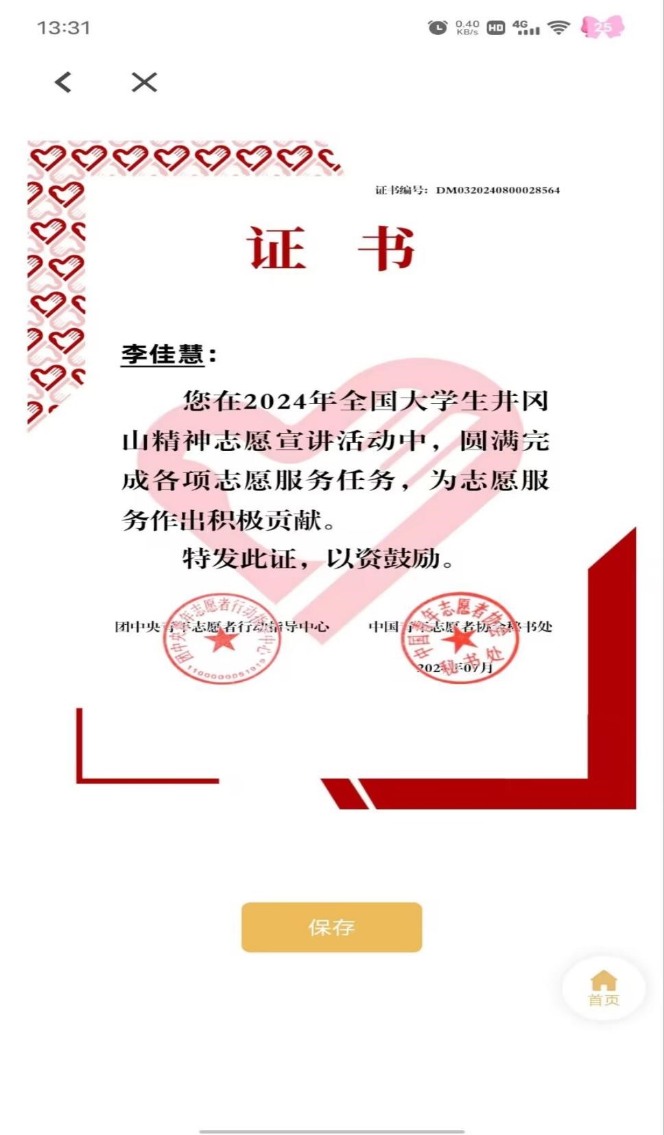 Beat365官网李佳慧同学在2024年全国大学生井冈山精神志愿宣讲表现优秀,对该同学予以祝贺表彰。