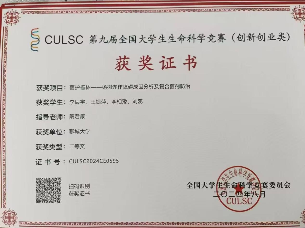 Beat365官网刘蕊同学在CULSC第九届全国大学生生命科学竞赛中荣获二等奖,对该获奖同学予以祝贺表彰。