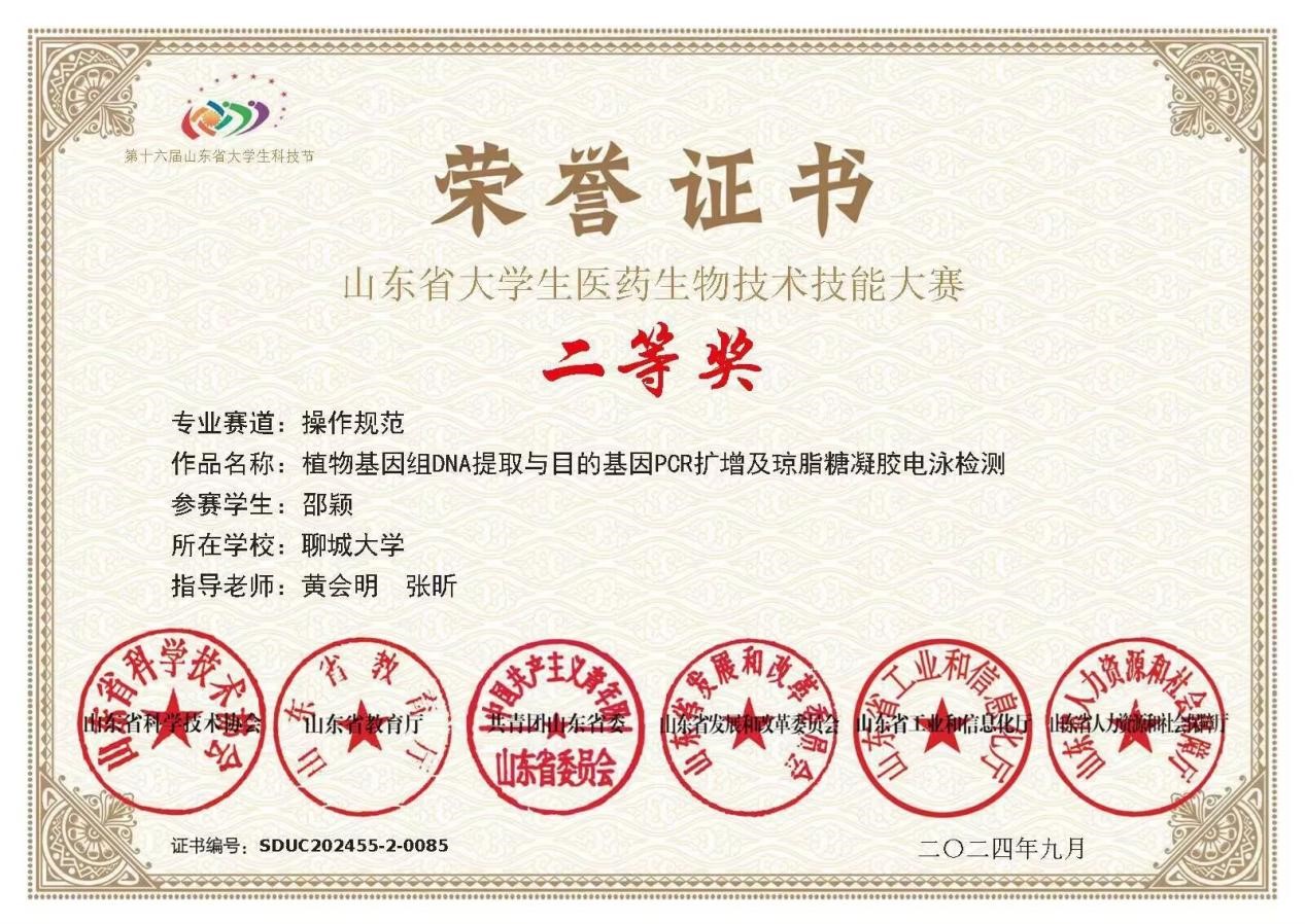 Beat365官网邵颖同学在山东省大学生医药生物技术技能大赛中荣获二等奖,对该获奖同学予以祝贺表彰。