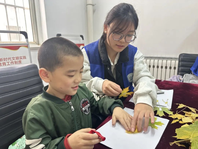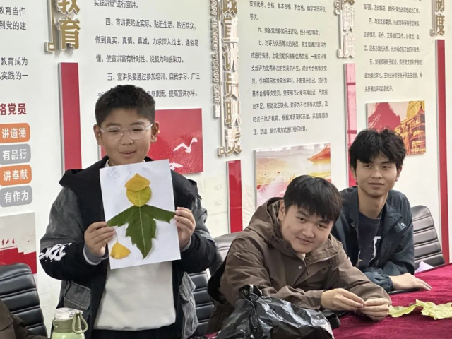 有一位小朋友利用枫叶等落叶制作了一幅“太阳花”作品,他希望每一天都阳光明媚,自己可以出去踢足球;还有一位小朋友利用银杏叶、梧桐叶等落叶创作了一幅“落叶人”的作品,他想象自己拥有一双银杏叶一样的翅膀,可以飞往高空,飞向自己未曾到达的地方。一幅幅精美的作品在大家的手中诞生,不仅展现了大自然的魅力,也体现了志愿者与小朋友间的默契与和谐。