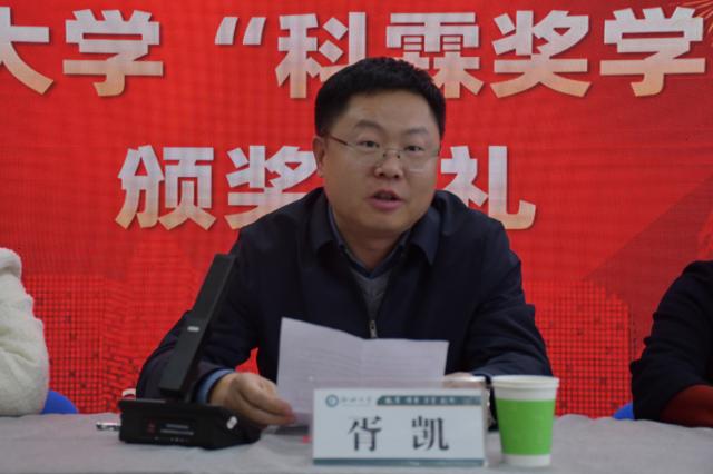 12月12日,Beat365唯一官方网站“科霖”奖学金颁奖仪式在Beat365唯一官方网站举行。山东省科霖检测有限公司总经理胥凯(1998级校友)、质控科科长贾国霞等企业代表,Beat365唯一官方网站党委学生工作处副处长唐玉琴,Beat365唯一官方网站院长贾泽峰,党委副书记、副院长吴洪宇以及部分教师、学生代表共同参加仪式。